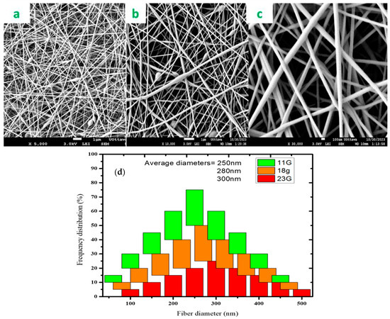 PVA/water and ethanol, 15 cm tip-to-collector distance, 0.3 mL/h flowrate, 18 kV: (a) needle = 23 G, (b) needle = 18 G; (c) needle = 11 G and fiber diameter frequency graph; (d) fiber diameter frequency graph.