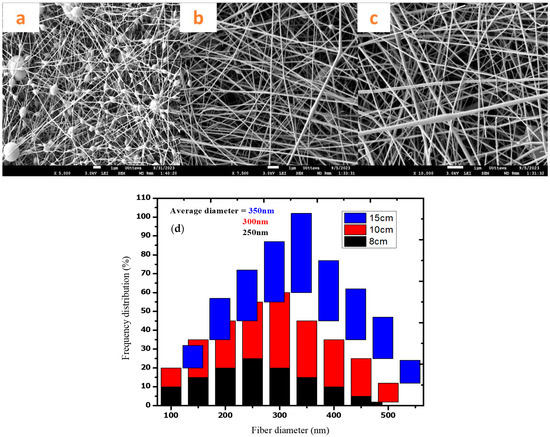 The tip-to-collector distance (TCD) also plays a crucial role in the electrospinning process as it determines the flight time of the jet, the stretching of the polymer solution, and the deposition pattern on the collector [44,45]. The shorter TCD led to a formation of beads due to the charged jet not having enough time to stretch and solidify before reaching the collector resulting (Figure 6a). In this case, the TCD was kept at 8 cm with the resulting fibers having diameters below 100 nm. The resulting beaded fibres are formed as the jet did not have sufficient time for stretching because of the short flight time. This meant that the solvent did not have time to evaporate, resulting in the formation of beads. However, the increase in the TCD created more space for elongation and stretching, thus leading to smooth fibers without beads. When the TCD is 10 cm, there are smooth fibers with less beads (Figure 6b). The resulting fibers had an average diameter ranging from 300 to 350 nm. In the case of 15 cm TCD, the fiber diameter was about 350 nm, as seen in Figure 6c. There was enough time for solvent evaporation from the charged jet, resulting in smooth fibers. In addition, the distance allowed the stretching of the jet. Purwar et al. (2016) [46] reported that the shorter TCD lead to the formation of beads without a fibrous structure being observed. The authors observed smooth fibers when the distance was increased from 3 cm to 8 cm; they attributed such a behaviour to the charged jet being stretched enough prior to the deposition to the collector. They indicated that a shorter TCD led to a shorter flight distance for the jet. This resulted in uneven stretching and incomplete solvent drying of the jet before reaching the collector, thus resulting in beaded fibers.