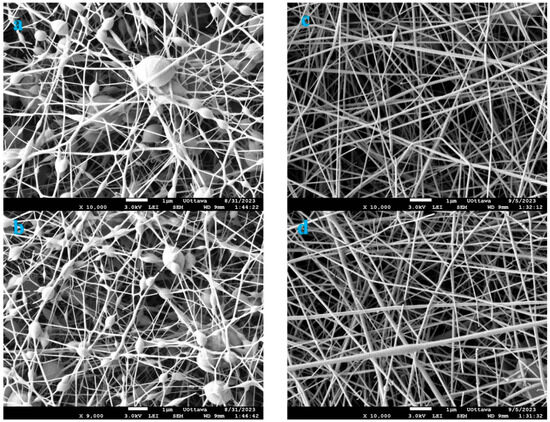 Determining the optimal degree of hydrolysis for PVA was essential for achieving desirable material properties and processability. When comparing PVA with degrees of hydrolysis of 87–90% and 99%, considering their respective advantages and disadvantages is crucial. Analysing the data presented in Table 2 and Section 2.2 (Table 1) for PVA solutions of different degrees of hydrolysis (DH) dissolved in water, PVA with a DH of 87–90% displayed better conductivity, spinnability, and viscosity when compared to PVA with a DH of 99%, thus resulting in the formation of smooth fibers. The PVA solution with a DH of 87–90% exhibited lower conductivity (1054 µS/cm) compared to the 99% DH solution (839 µS/cm), which is beneficial for jet stretching during electrospinning and ensuring uniform thinner fiber deposition.