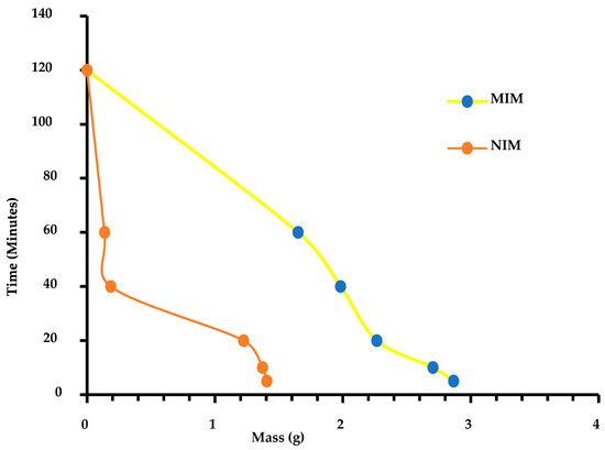 The results obtained from the centrifugation experiment conducted on the PVA 87–90 DH electrospun MIM and NIM revealed an interesting trend in the weight of the materials over different time intervals. For the MIM, the weight decreased as the centrifugation time increased, starting at 2.864 g at 5 min and decreasing to 1.6483 g at 60 min before completely dissolving at 2 h. On the other hand, the NIM also showed a decrease in weight over time, starting at 1.404 g at 5 min and diminishing to 0.136 g at 60 min before complete dissolution at 2 h. This trend in weight loss can be explained based on the chemistry of PVA. PVA is a water-soluble polymer that swells in water and can dissolve when exposed to prolonged contact with water. The decrease in weight of both MIM and NIM membranes over time can be attributed to the continuous hydration and swelling of PVA molecules in contact with water during centrifugation. This hydration causes the polymer chains to separate and dissolve, leading to the observed weight loss. Additionally, the presence of molecular imprints in the MIM could potentially affect the dissolution behaviour compared to the NIM, as the specific interactions between the imprinted sites and target molecules influence the swelling and dissolution properties of the membrane. Further investigation into the molecular imprinting process and the effects of specific interactions on the dissolution behaviour could provide valuable insights for the development and optimization of PVA-based membranes for various applications. Figure 8 shows the swelling study graph.
