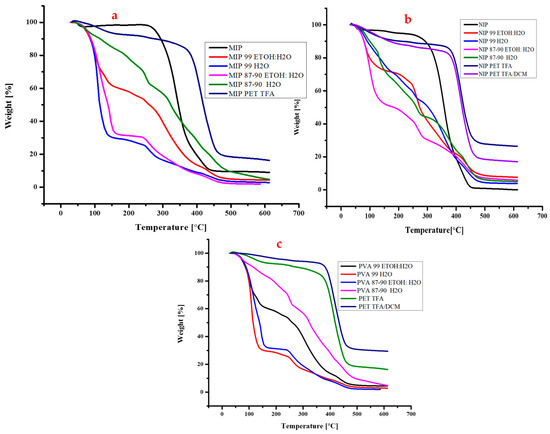 In contrast, the NIP–polymer mixture with MIP exhibits a relatively low temperature range for weight loss, indicating a more stable thermal behaviour. The most pronounced weight loss is observed around 80 °C, suggesting a thermal degradation event. The NIP–polymer mixture with PET TFA/DCM exhibits a complex temperature range for weight loss, with significant degradation occurring between 200 °C and 400 °C. The most pronounced weight loss is observed around 400 °C and 460 °C, suggesting multiple thermal degradation events. A study by Yang et al. (2021) [57] revealed that PVA undergoes significant thermal degradation between 216 °C and 320 °C, resulting in substantial weight loss due to the breakdown of its polymer backbone. Notably, the highest rate of weight loss occurred at 278 °C. In contrast, a lower temperature of approximately 130.3 °C led to a minor weight loss of around 5% due to dehydration. When subjected to high temperatures, PVA decomposes completely, leaving no residue behind. This decomposition is attributed to oxidative processes involving organic substances in an air-containing atmosphere. Factors such as molecular weight, molecular structure, and degree of crystallinity can influence the degradation of PVA, while its state (molten or solid) also impacts its thermal degradation, resulting in distinct TG profiles.