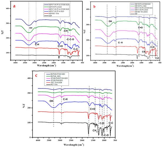 FTIR spectra of PVA, PET solution with (a) MIP and (b) NIP additives and (c) without.