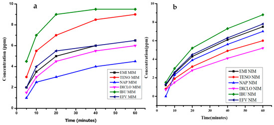 The adsorption behaviour of various drugs (EMI, TENO, NAP, DICLO, IBU, EFV) on both molecularly imprinted membrane (MIM) and non-imprinted membrane (NIM) materials over different time intervals (5, 10, 20, 40, 60 min) was investigated. The data reveal the amount of each drug adsorbed onto the materials at each time point, providing insights into the adsorption kinetics of the drugs. Figure 11 portrays the pharmaceutical adsorption process using an electrospun-based PVA-MIP material over different time intervals. As expected, the results indicate a gradual increase in pharmaceutical adsorption as the time of contact between the material and the solution increases. This is consistent with the typical behaviour of adsorption processes where the adsorption capacity of the material increases over time, eventually reaching a plateau where equilibrium is achieved. Starting with EMI, the graph shows that EMI exhibits higher adsorption onto MIM compared to NIM for all time intervals. Similar results were reported in a PET-MIP-based material to adsorbent rhodamine blue dye in river water [61]. This suggests that the MIM material may have specific recognition sites for EMI, enhancing its adsorption capacity. The trend is consistent across all drugs, indicating the effectiveness of molecular imprinting in enhancing selectivity and adsorption efficiency.