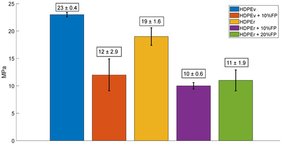 Figure 1 shows the tensile strength of the evaluated materials. Virgin high-density polyethylene (HDPEv) exhibited a tensile strength of 22.77 MPa and a strain of 16.9%. These results are attributed to the material not having been subjected to any previous heating processes. In comparison, recycled HDPE (HDPEr), which had been processed at least twice, showed a tensile strength of 18.7 MPa and a strain of 4.3%, demonstrating a significant decrease of 12.6% in strain.