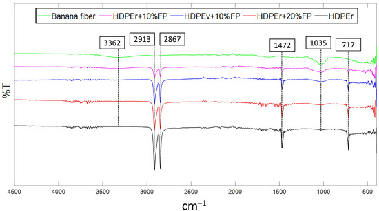 FTIR is an effective method for detecting the functional groups present in raw materials and the developed composites (HDPEv + 10% BF, HDPEr + 10% BF, and HDPEr + 20% BF), aiding in the investigation of the characteristics of banana fiber and recycled HDPE. The characteristic infrared bands of the functional groups are listed in Table 3.