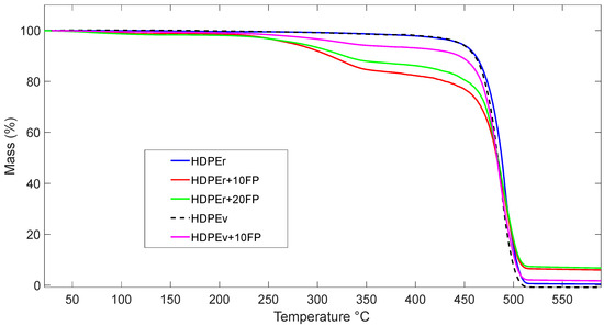 In Figure 3, two stages of degradation are observed in the three samples of fiber-reinforced composite materials (HDPEr + 10% BF, HDPEr + 20% BF, and HDPEv + 10% BF). The first stage occurs between 25 °C and 125 °C, with a mass variation of ~2.0%, corresponding to the loss of physically adsorbed water. In the temperature range of 125 °C to 300 °C, thermal degradation comprises multiple stages, including the degradation of pectin and hemicellulose, followed by cellulose and lignin. The second stage of degradation is observed between 300 °C and 550 °C, with a mass change of approximately 6.0%, which can be attributed to the loss of HDPE. The higher mass loss in the first stage suggests that the materials contain minimal physically adsorbed water, specifically in the natural fiber.