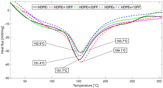 Differential scanning calorimetry (DSC) testing was performed on five samples: HDPEr, HDPEr + 10FP, HDPEr + 20FP, HDPEv and HDPEv + 10FP. The test had a maximum temperature of 320 °C, with an endothermic event observed at approximately 150 °C.