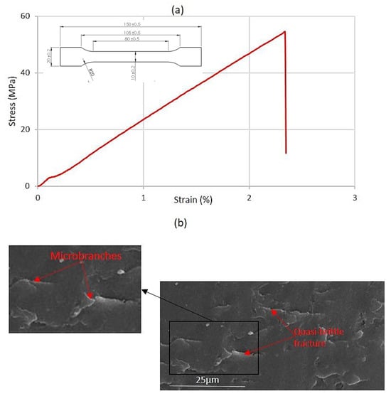 The standard PMMA sample was loaded in tension until it fractured, allowing for the measurement of various mechanical properties. Figure 3a illustrates the measured tensile curve. Tensile properties and fracture toughness data were obtained through a series of tensile tests conducted on a standard PMMA specimen and compact tension specimen. We obtain as mechanical properties Young’s modulus, E = 2.9 GPa; ultimate tensile strength, UTS = 56 MPa; elongation at break, A% = 2.4%; Poisson’s ratio, ν = 0.35; and fracture toughness, KIC = 0.8 MPa/mm½. A scanning electron microscopy (SEM) analysis of the fractured surface of PMMA was conducted (Figure 3b).
