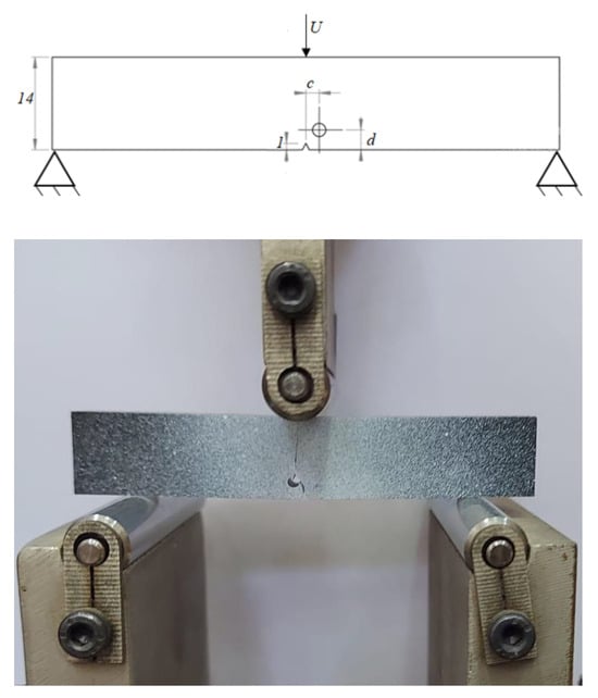 A notched specimen with a 2 mm diameter hole was subjected to three-point bending loading, as shown in Figure 4. The specimen dimensions were 80 mm in length, 14 mm in width, and 10 mm in thickness. A support span of 60 mm was used for the three-point bending setup. The length of the bottom notch was l = 1 mm. The distance between the notch and the axis of the hole is denoted c. The distance between the axis of the hole and the bottom edge of the PMMA specimen is d.