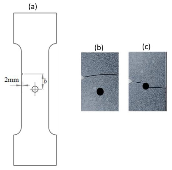 Notched specimen with a hole: (a) specimen geometry; (b) tensile test with b = 10 mm; (c) tensile test with b = 4 mm.