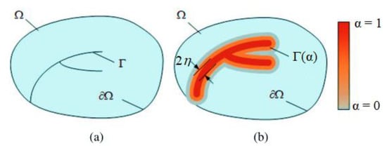 (a) Schematic illustration of discontinuity discrete crack zone Γ; (b) approximation of the diffusive damage field by the phase-field.