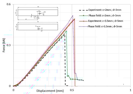 It was observed that the crack propagation paths are influenced by defects introduced as holes and notches. The evolution of force displacement is depicted in Figure 9 for notched specimens featuring a hole, with varying distances between the notch and the hole’s axis.