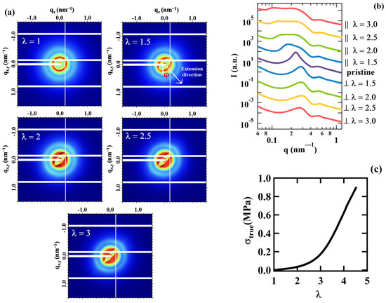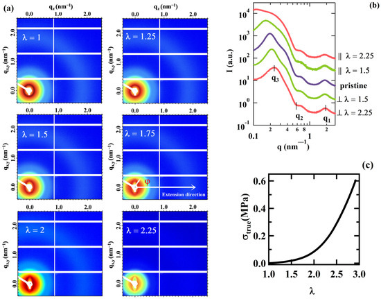 One-dimensional sections of the 2D patterns illustrate the evolution of scattering intensity along both parallel and perpendicular directions relative to the stretching axis (Figure 1b and Figure 2b). The observed shift of the primary interference maximum to lower q values contrasts with the perpendicular direction, where an opposite trend is observed. Notably, the interference maximum broadens substantially along the stretching direction, whereas the form factor of the domains remains nearly unchanged.