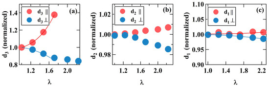 (a–c) Variation of the normalized values of d1, d2, and d3, respectively, as a function of λ during the stretching of sample PDMS-PMMA_3. The values of d3,‖ are not measurable above λ of 1.75. The solid lines in (a) represent fits based on Equation (14).