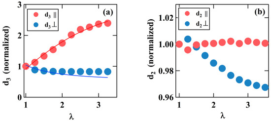 The evolution of the normalized d3-spacing as a function of λ is shown in Figure 3a and Figure 4a. The normalized d-spacing is calculated using the formula: . The solid lines represent the relationship between the d3 values in the directions parallel and perpendicular to the stretching direction (d3,‖ and d3,⊥), following the equation: