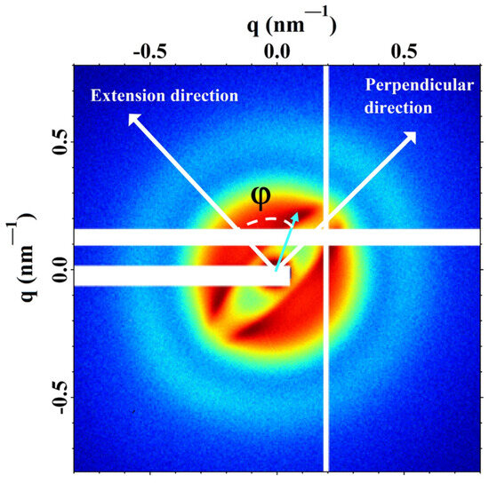 To gain further insight into the structural evolution during uniaxial stretching, we plotted the angle φ—defined as the angle between the stretching direction and the SAXS maxima associated with the four-spot pattern—as a function of λ (Figure 6). The data reveal that as λ increases, φ increases from approximately 35° to around 70°. Notably, data points from all samples align along a single master curve, indicating a consistent structural evolution across samples. This observation suggests that the initial liquid-like state may possess an underlying, latent, long-range order.