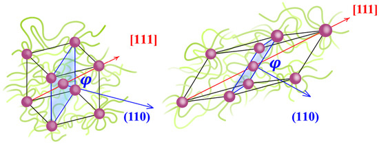 During deformation, the change in angle between the stretching direction and the normal to the (110) plane can be monitored. This plane produces the strongest diffraction peak in the lattice, appearing at the lowest q-value. The schematic in Figure 7 illustrates that this angle increases with λ, consistent with our experimental observations above. The analytical expression for the angle between the [111] direction and the normal to the (110) plane can be derived from the equations of the respective planes as a function of the sample elongation λ: