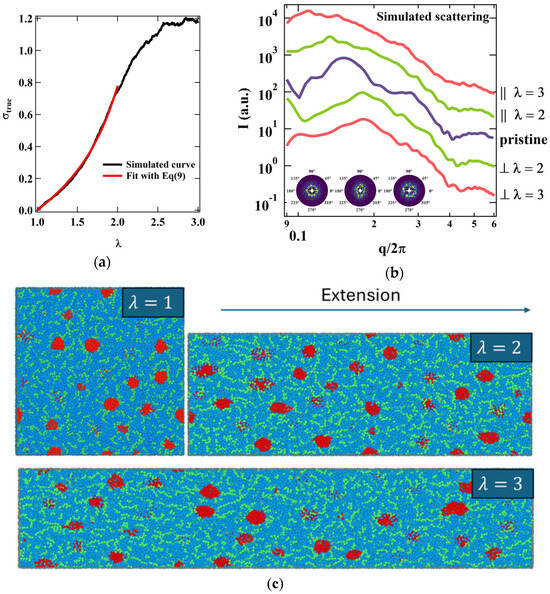 (a) The true stress dependence on λ = L/L_0. The black line corresponds to simulation results, and the red line corresponds to fits with Equation (9). (b) Scattering intensity profiles calculated for the hydrophobic beads along the stretching direction and perpendicular to it, with corresponding 2D SAXS patterns shown as insets. (c) Snapshots of the system at different drawing ratios λ.