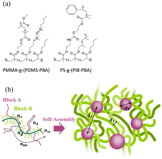 Three series of BB elastomers with two different types of graft blocks (polymethylmethacrylate and polystyrene) and two different types of side chains (poly(isobutylene) and polydimethylsiloxane)) were synthesized. The synthetic procedures used are described elsewhere [27,28,38]. The chemical structures of the synthesized copolymers are shown in Scheme 1a. The degrees of polymerization (DP) of side chains (), the DP of the backbone between crosslinks (), DP and volume fraction of the A-block, DP of total brush backbone, and number of spacer repeat units between side chains are provided in Table 1. The microstructural parameters of the self-assembled structure of the copolymers are specified in Scheme 1b.