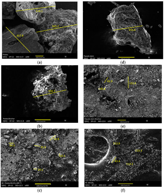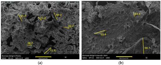 Table 3 lists the textural properties of raw materials and their modified materials. Raw materials exhibited the less porous structure as the lowest total volume, but PS showed a major micropore structure and a larger specific surface area (23.3 m2/g). The carbonization process at 500 °C acted mainly on the cellulose and hemicellulose units depolymerizing them into smaller units resulting in a large carbon-rich mass, mesopore structure, and wider micropore width. Conversely, PS with a larger lignin content upon pyrolysis rendered a more micropore structure although not reflected on the specific surface area. This result was confirmed by performing the material delignification process with NaOH. The lignin content was PS = 59.48% and PP = 20.06%. It was also evidenced in the SEM micrographs of the raw materials without lignin, showing how the raw potato presents an orderly arranged cell wall with a structure surrounded by starch granules. In contrast, the pseudo exhibited rod structure with a relatively smooth, clean, compact surface without lignin, Figure 1a,b.