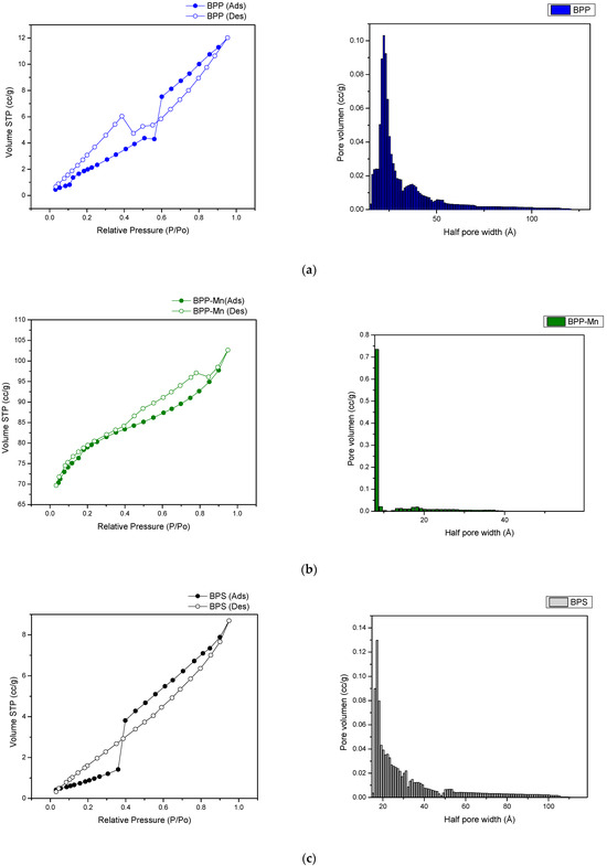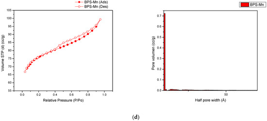 In Figure 2a–d the morphological change of the raw material compared to the modified material is observed. The mesoporosity increases due to temperature. The gases generated during the pyrolysis process promote thermal exfoliation. However, it is notable that the metal decreases mesoporosity due to an increase in its width and volume (Table 3). This may be related to the ease with which the carbonate in the metal salt generates CO2 and its effect on the system’s exfoliation. The CO2 generated from the carbonate stabilizes metal oxides, which increases the surface area (Equation (11)), but also fragments the particle and contributes to the stability of metal oxides. The surface manganese content is displayed, highlighting its effect on increased nucleation in the carbon matrix. The manganese is homogeneously distributed in both functionalized materials for BPP-Mn and BPS-Mn. Figure 3a–d, Table 4 [32].