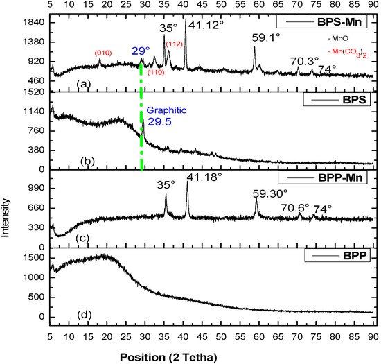 In Figure 4, additionally, the XRD patterns for the carbonaceous materials were characterized. A peak is detected at approximately 29° in 2θ, associated with the graphite structure (graphite 002). This peak indicates an arrangement of aromatic layers, and the broadening is due to the small size of the crystallites that are perpendicular to these layers. Meanwhile, the XRD patterns peak at ~35°, ~41°, ~59°, ~70°, and ~74° about the (111), (200), (220), (311), and (222) crystal planes of the MnO phase [29], as well as carbonate manganese (011) 21°, (110) 33° and (112) 36° [30] which observed for BPS-Mn. However, the BPP-Mn material presented high a ratio for MnO phase.