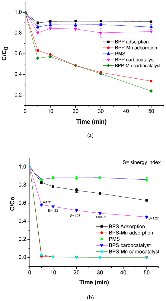 Figure 5 depicts the adsorption and carbocatalytic process for pyrolyzed and manganese-modified materials. The molecule used for this study was acetaminophen, an emergent contaminant found in hospital wastewaters. The PMS representing an oxidant molecule showed a degradation percentage of 17%. However, the BPP and BPP-Mn behavior suggest these materials had a high adsorption properties. The role of manganese in BPP increases the interaction with the ACE (BPP-Mn remotion of 72%, t = 50 min), Figure 4a. On the other hand, in Figure 4b the pyrolyzed material of pseudo-steam enhances the adsorption vs. peel potato in a special case for BPS-Mn. For the BPS-Mn, the adsorption capacity was ~100% within 10 min of treatment. Further, the chromatographic profile for BPS-Mn was analyzed, finding the presence of degradation products at short treatment times and a high adsorption capacity, Figure S1. This is attributed to competition between processes. Finally, an interesting synergistic effect was appreciated, the BPS material might be activating PMS and degrading the contaminant, increasing the remotion to ~40%. The S-index describes the mathematical additive effect of two independent processes (adsorption and degradation using PMS), being ~1.2, at t = 5 min. Both materials (BPS and BPP) were synthesized under the same experimental conditions. It suggests that the substrate or the liglignocellulosic material defined their adsorbent or carbocatalytic properties. As observed in Figure 1 and the reported lignin content, the presence of lignin in the banana pseudostem enhances the surface area obtained after the pyrolysis process. In contrast, the starch structure in the potato hinders drug adsorption for ACE, a molecule charged negatively to pH circumneutral.