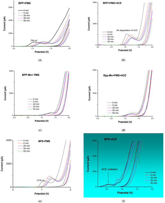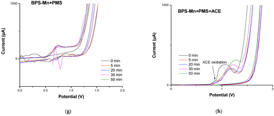 Voltammetry cycles for material activation and carbocatalytic process with and without PMS, scanning rate of 20 mV s−1, −2.0 V, and +2.0 V as support electrolyte: [Na2SO4] = 0.1 M, (a). BPP + PMS, (b). BPP + PMS + ACE, (c). BPP_ Mn+ PMS, (d). BPP_ Mn + PMS + ACE, (e). BPS + PMS, (f). BPS + PMS + ACE, (g). BPS_ Mn + PMS + ACE and (h). BPS _Mn + PMS + ACE.