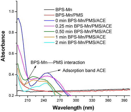In Figure 6a–h the voltammograms for the materials were recorded under the influence of the oxidizing agent PMS and their exposure as a system to acetaminophen. Oxidation peaks are found at around ∼1.2 V in the presence of PMS and the absence of ACE. The anodic peak (Ia) observed for BPP, Figure 6a indicates differences like the easily oxidizable compounds in the presence of PMS at t = 0 min. The Ia peak can be attributed to vanillin (a lignin degradation product detected around 500 °C) identified in BPP [31] and BPS, Figure 6e. In this case, the intensity peak is major (1018 μA), suggesting more concentration of lignin as a precursor in BPS. For systems with manganese without ACE, the peak (Ia) shifts to higher potential values (1.4 V), highlighting the presence of degradation products formed between 500 °C and 800 °C, Figure 6c,g. The increase in temperature during synthesis and the role of manganese alters the surface properties and consequently impacts the electrochemical oxidation. In the case of the voltammograms corresponding to the systems with the contaminant (ACE) Figure 6f, only an additional oxidation peak is observed for the BPS material, which is consistent with the oxidation of acetaminophen and carbocatalysis for this system about the others, Figure 6b,d,h. The new oxidation peaks are observed for BPS-Mn, which is expected for carbonate and manganese oxide oxidation products. However, these species would be coordinated to ACE, blocking its oxidation for ACE or competition for adsorption places in BPP. It is interesting to note that ACE degradation is also observed for BPS-Mn, as evidenced electrochemically. This is consistent with the reported degradation and its competition with adsorption processes. It is demonstrated that the material, in the presence of manganese, can activate PMS, which in turn interacts with the ACE molecule, facilitating its degradation. To understand this process, absorption spectra were obtained at the characteristic wavelength of acetaminophen, showing an increase in intensity upon interaction with PMS, confirming their interaction, Figure 7. Similarly, experiments were conducted with the carbonaceous material BPS-Mn, with the addition of PMS and ACE, resulting in an increased absorption intensity, which suggests an interaction among these three molecules. The absorption was following since t = 0 min until t = 2 min, observing degradation ACE, as is observed in the electrochemical studies previosly.