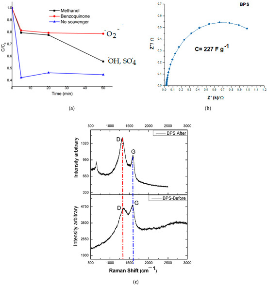 The molecules that scavenge hydroxyl, sulfate, and anion radical superoxide were tested in the degradation of acetaminophen. They were blocking the degradation kinetics by competition with the scavenger allowed for identifying the species responsible for removing acetaminophen, as shown in Figure 8a. On the other hand, the electrochemical impedance study of the BPS material was conducted to demonstrate its capacitive capabilities, which allow for better electronic transfer in this type of carbonaceous material, with a value of 227 F/g, placing it within the range for materials with a high degree of lignin, as shown in Figure 8b. Finally, RAMAN analyses were performed before and after using the material, finding a relationship between the exposed surface functional groups and their role in the degradation process, Figure 8c.