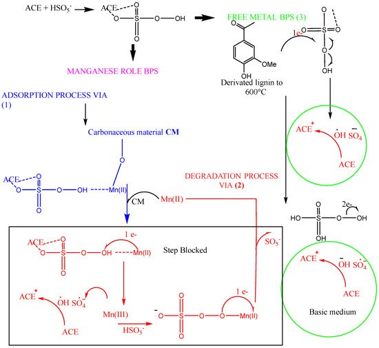 Figure 5a,b shows the adsorption and degradation processes of all materials concerning ACE. The pyrolyzed BPS material exhibited a synergistic effect, functioning as a carbocatalyst. However, the incorporation of metal ions into the system enhanced the adsorption of ACE. The electrochemical behavior, represented by the oxidation peak associated with manganese, was inhibited by ACE, suggesting the formation of a stabilized coordination compound, which in turn reduced the carbocatalytic activity. Lignin is the strongest component due to its highly aromatic structure of phenylpropane units in BPS concerning BPP as reported in the literature and observed in electrochemical analyses, evidencing vanillin. When lignin is pyrolyzed, the β-O-4 bonds break, forming a series of free radicals, which repolymerize to produce bio-oil, syngas, and biochar. To 500 °C phenolic compounds such as vanillin favor the coordination bonds between carbonaceous material-Mn:PMS: ACE, in high grade concerning materials with low lignin content as potato peel [33] Figure 6a–c,e–g. On the other hand, the carbonate/bicarbonate ions are strong scavengers of both hydroxyl and sulfate radicals, with high reaction rate constants, which may explain this effect, low carbocatalysis in the presence of metal carbonate (Equations (13) and (14)) [34] as depicted in Figure 6d,h.