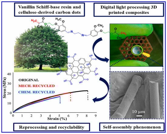 Liguori et al. [69] investigated the self-assembly of carbon dots in a vanillin Schiff-base resin-based 3D printing ink. These carbon dot-based composites were formed into fibers embedded in a thermoset matrix using 3D printing with digital light processing, demonstrating both physical and chemical recyclability, as shown in Figure 1. Incorporating carbon dots enhanced the retention of the material’s characteristics throughout the recycling process.