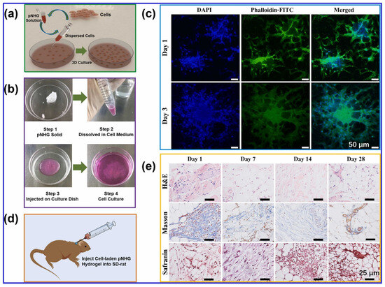 (a) The illustration of cell-laden pNHG hydrogel preparation. (b) The white pNHG solid powder is dissolved in cell solution (around 20 °C) first, and the cell-loaded solution is transferred to a Petri plate, then the Petri plate is put in a cell incubator with 95% air and 5% CO2 at 37 °C. Once the cell-laden hydrogel is formed, more cell medium is added for further cell growth. (c) Fluorescent images of hBMSCs encapsulated in pNHG2 hydrogels over days; the cells are stained with DAPI (blue) and Phalloidin-FITC (green). (d) The illustration of hBMSCs-laden pNHG2 hydrogel injected in the neck of SD rat. (e) Optical micrographs of H&E, Masson, and Safranin staining slices of surrounding tissues after injection of hBMSCs-laden pNHG2 hydrogel subcutaneously over days. Adapted with permission from [17]. Copyright Elsevier 2022.