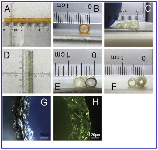 Morphological comparison between polymeric and CNT containing polymeric 3D printed vessel scaffolds. (A,B) Radial and axial views of printed vessel scaffolds, with an average diameter of 3.5 mm and wall thickness of 0.5 mm. (C) Multi-sized tubes with outer diameters of 3, 4, and 5 mm. (D,E) Macroscopic comparison between scaffolds incorporating carbon nanotubes (CNT) and blank (non-CNT) scaffolds. (F) Vessel scaffold structures produced using rotation-axis versus vertical-stacking methods. (G,H) Polarizing microscope images (10× magnification) comparing Gel-SA-1%C and Gel-SA-0.5%C scaffold groups. Adapted with permission from [25].