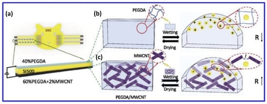 Schematic of a three-layer liquid sensor: (a) The sensor includes a non-conductive (SI500) layer, a PEGDA hydrogel layer, and a PEGDA/MWCNT hydrogel layer. (b) In wet conditions, the PEGDA layer’s resistivity decreases due to water-facilitated electron transport, while the PEGDA/MWCNT layer’s resistivity increases as MWCNT spacing expands. (c) the conductivity of PEGDA/MWCNT composite hydrogel by swelling behavior in wetting and drying state. Adapted from [80].