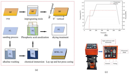 Diagram of the BFRL/AL forming process. (a) Experimental specimen production, (b) heat-pressing process, (c) hot pressure test machine. (BF: Basalt fiber; DC: Direct current).