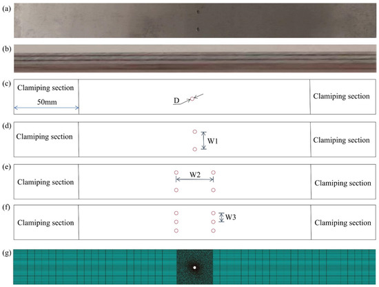 In this study, the FMLs were completed by heated compression curing and then cut, punched, and drilled using a metal machine. This was performed to generate FML samples with varying spacings and perforation counts, as illustrated in Figure 2. The samples were 250 mm in length and 25 mm in width, and their parameters conformed with the ASTM-D3039 standard. The aperture spacing was w1 = 12.5 mm, w2 = 25 mm, and w3 = 6.25 mm, and the clamping length was 50 mm. Figure 2c–f illustrates this. Ultimately, the prototypes were refined.