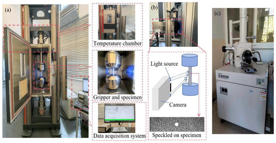 Tensile test for various temperatures. (a) Zwick/Roell tensile test machine, (b) DIC test machine, (c) SEM test of fracture specimens.