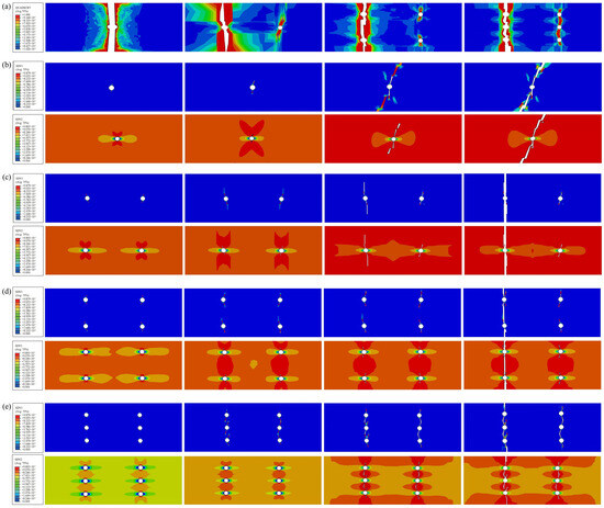 Damage evolution of composite layers. (a) Comparison of interlayer damage between FML specimens, (b) single hole, (c) two holes, (d) four holes, (e) six holes.