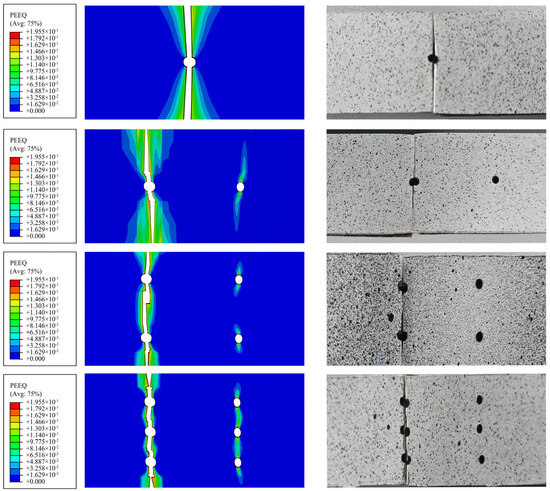The fracture mode of the metal layer simulated by the Johnson–Cook damage model is essentially identical to that of the tensile test. Stress concentration is observed in the vicinity of the circular cavity, as indicated by finite element analysis. Some degree of delamination and brittle fracture is present with the fracture mode. It is evident that the plastic injury area of the metal layer increases as the number of analysis stages and the burden increase. Plastic yielding and necking are also evident in the aluminum alloy layer cross-section. The observed range of fracture failure is consistent with the expansion of cumulative plastic deformation in the aluminum alloy layer. This is demonstrated through a comparison of the experimental strain diagram and the PEEQ equivalent plastic strain diagram, as illustrated in Figure 5.