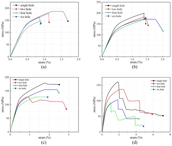 Stress–strain curves and mechanical responses of FML residual strength with various openings. (a) 30 °C, (b) 80 °C, (c) 130 °C (d) 180 °C.