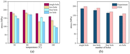 Based on the stress–strain curves in Figure 6, Table 5 records the ultimate tensile stresses of the same specimen for three experiments at the same temperature. In addition, the average value for each temperature case was calculated. In order to make a more intuitive comparison, ultimate tensile stresses at different temperatures with varying numbers of holes were plotted according to this table, as shown in Figure 7a. For the tensile load versus temperature of FML, it can be found that the strength of specimens with single holes decreased less at different temperatures. This was with an average decrease of 10.72% at 180 °C equivalent to 30 °C. As a whole, the tensile load decreases at temperatures above 80 °C due to localized delamination caused by matrix softening. The results show that the ultimate tensile stress at 180 °C is drastically reduced (33.9%) compared to the 130 °C condition. An interesting phenomenon worth noting is the slight increase in tensile stress at 80 °C (6.23%) compared to that at 30 °C. This may be related to the curing process, in which the temperature of the specimen preparation process facilitates the elimination of curing defects in the resin matrix. In addition, the temperature increase effectively eliminates internal stresses generated during hot pressing. Therefore, the elimination of defects in the epoxy resin matrix at higher temperatures improved the specimens’ tensile characteristics.