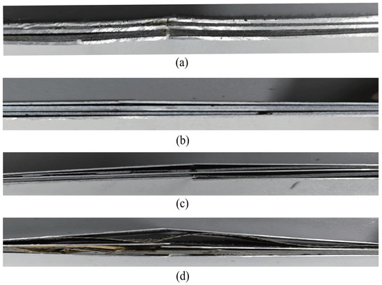 The specimen fracture is relatively planar at the fracture site when the temperature is lower than 130 °C, as illustrated in Figure 8. A modest delamination phenomenon occurs between the layers. The delamination damage becomes more severe as the temperature exceeds 130 °C, and the fracture extends to both extremities. The fractured specimen demonstrates decoupling of the resin from the matrix in the fiber layer. The bonding layer between the fiber and the metal layer exhibits a clear damage phenomenon as the temperature and tensile load increase. It is also possible to infer that the matrix’s softening becomes more pronounced when the environment’s temperature surpasses the melting temperature. Between the strata, a substantial quantity of resin matrix fragments is observed. The fiber layer in the specimen did not fracture when the test temperature was increased to 180 °C. There was only one apparent fissure in the metal layer, and resin matrix fragments were visible between the layers. Therefore, the aluminum alloy layer assumed the primary load-bearing function when the temperature exceeded 170 °C.