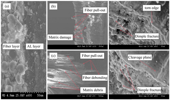 The delamination phenomenon between the fiber layer and the aluminum alloy layer is evident in Figure 8a following the damage. The initial damage to the fiber and matrix was caused by the change in stress gradient between the fiber layer and the aluminum alloy layer. This was during the FML tensile process. As a consequence, the toughness damage expanded rapidly along the crack direction, resulting in a reduction in the load-bearing capacity. Subsequently, a delamination phenomenon occurred between the FML layers, and the final damage to the FML as a whole occurred. The fiber layer was subjected to the majority of the load when the temperature was between 30 °C and 130 °C, and it fractured prior to the aluminum alloy layer during the tensile process. This was a contributing factor to the FML’s load-bearing capacity loss, as it resulted in a rapid reduction in the ultimate load-bearing capacity.