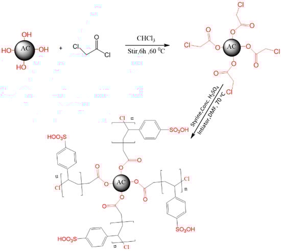 Polystyrene sulfonate-incorporated activated carbon was prepared via a novel and simple method. A mixture of carbon olive ash (1 gm) and 5 mL chloroacetyl chloride in 20 mL chloroform was heated under reflux for 6 h. The resulting precipitate was then collected and dried to afford the chloride derivative in good yield. After that, 1 g of chloride derivative, 7 mL of styrene, 5 mL of concentration sulfuric acid, and 1 g of initiator in 20 mL dimethylformamide were heated at 70 °C for 8 h. Then, the resulting suspension was poured into an ice/water mixture and stirred to obtain the solid residue. Finally, the sulfonate-incorporated activated carbon was filtered off and dried at 50 °C for 24 h (Figure 1).