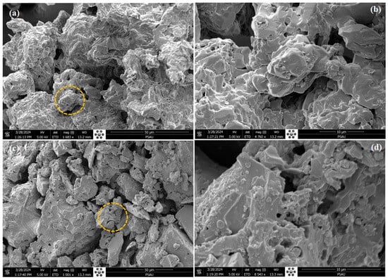 The SEM images provide detailed insights into the morphological differences between the activated carbon (AC) and the polystyrene sulfonate-modified activated carbon (AC@PSS) composites. In the SEM images of AC (Figure 2a,b), the surface morphology shows irregular and rough textures, with distinct pore structures visible. The images reveal a highly porous and amorphous structure typical of activated carbon, crucial for its adsorption properties. In contrast, the SEM images of the AC@PSS composite (Figure 2c,d) display significant modifications to the surface morphology. The polystyrene sulfonate (PSS) modification appears to have coated the surface of the activated carbon, resulting in a smoother and more uniform texture. The pores are still visible but seem more homogenously distributed and less pronounced than the unmodified AC. This suggests that the PSS coating has filled some pores or formed a thin layer over the surface, which could enhance the composite’s adsorption and photocatalytic properties. These morphological changes, observed in the SEM images, indicate successful modification of AC with PSS. The smoother surface and altered pore structure of AC@PSS will likely contribute to improved interaction with methylene blue molecules, thereby enhancing the composite’s overall performance in photo-degradation applications.