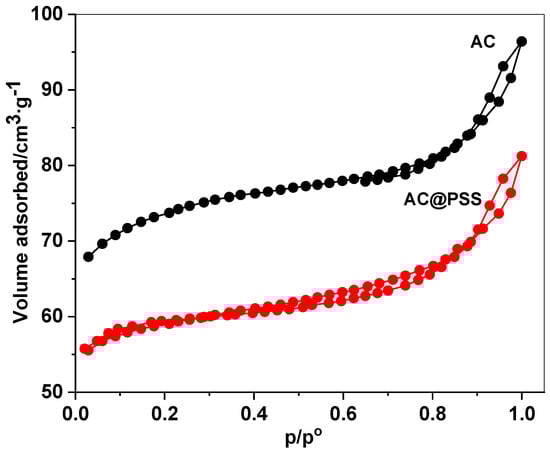 The nitrogen adsorption–desorption isotherms of activated carbon (AC) and polystyrene sulfonate-modified activated carbon (AC@PSS) (Figure 3) reveal essential insights into their pore structures and surface characteristics. Both materials exhibit a Type I/IV hybrid isotherm, indicating a microporous structure with contributions from mesoporosity. The unmodified AC demonstrates high nitrogen uptake at low relative pressures (P/Po < 0.1). This reflects its well-developed microporous network and significant surface area, which is critical for adsorbing reactants and enhancing photocatalytic activity. Upon modification with polystyrene sulfonate (PSS), a reduction in nitrogen uptake is observed, particularly in the microporous region, suggesting partial pore blockage due to the coating. However, a slight increase in adsorption at intermediate relative pressures (P/Po = 0.3–0.8) indicates the introduction of mesoporosity, which may improve diffusion and facilitate access to active sites during photocatalytic degradation. The specific surface area of AC was measured at 60.25 m2/g, which decreased to 50.15 m2/g after modification with polystyrene sulfonate. This reduction in surface area can be attributed to partial pore blocking caused by the PSS coating. The total pore volume showed the same trend, decreasing from 0.1205 cm3/g for AC to 0.1003 cm3/g for AC@PSS. These changes in surface area and pore volume reflect the structural alterations induced by the PSS coating, which may play a crucial role in enhancing diffusion and adsorption during photocatalytic applications.