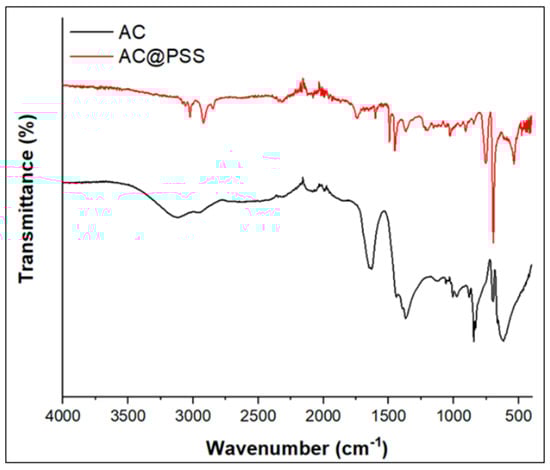 Figure 4 displays the FTIR spectrum of AC and AC@PSS. The FTIR spectra of AC showed various bands at 3123, 2945, 1635, 1436, 1361, 1119, 845, and 613 cm−1 attributed to the different molecules such as lignin, hemicellulose, and cellulose present in olive leaves [,,]. In detail, the band at 3123 and 2945 cm−1 is related to the stretching mode of ν(–OH) and ν(–C–H), respectively [,]. The bands at 1635 cm−1 are assigned to the stretching vibration of ν(C = O) in hemicellulose and lignin []. The peaks at 1436 and 1361 cm−1 are owing to the (C = C) stretching in aromatic rings and C–H asymmetric deformation, respectively [,]. The band in the range (1128–1009 cm−1) is due to the C–O vibration [,]. The bands at 845 and 613 cm−1 are assigned to the ring C–H out-of-plane bending []. In the spectra of the AC@PSS, different bands were observed at 3054, 1600, and 1491 cm−1, which are assigned to unsaturated aromatic ν(–C-H) and (C = C) stretching in aromatic rings, respectively []. The bands at 2920 and 2850 cm−1 are due to the asymmetrical and symmetrical ν(C–H) methylene (CH2) group, respectively []. The peaks at 754, 692, and 533 cm–1 describe various substitutions of the benzene ring of the polystyrene []. The characteristic band at 1739 cm−1 is because of the ester group. The characteristic bands in the range of 1002–1029 cm−1 are attributed to the symmetric stretching of the S-O of the SO3H moiety [,,]. All of these findings indicate the development of polystyrene sulfonate on the activated carbon.