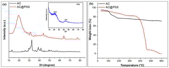 (a) XRD patterns of AC and AC@PSS composites (the inset is the XRD pattern of PSS) and (b) TGA profiles of AC and AC@PSS composites.