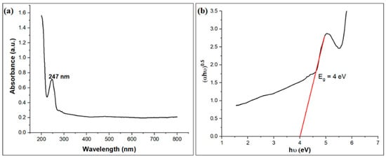 The UV–vis absorption spectra and Tauc’s profile for the band gap assessment provide valuable insights into the optical characteristics of the AC@PSS composite. Figure 6a shows the UV–vis absorption spectrum of the AC@PSS composite. The spectrum displays a prominent absorption peak at around 247 nm, indicative of the π-π* transitions associated with the aromatic rings in the polystyrene sulfonate (PSS) structure. This peak confirms the successful incorporation of PSS onto the activated carbon (AC) surface. The absorption in the visible region remains relatively small, which is typical for materials like AC and PSS that do not have significant absorption in this range.